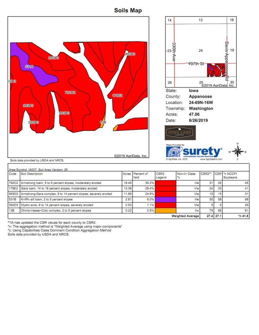 47.06 +/- Cropland Acres  |  14 +/- Tillable Acres  | 33 +/- Hay Acres  |   CSR2 27.4