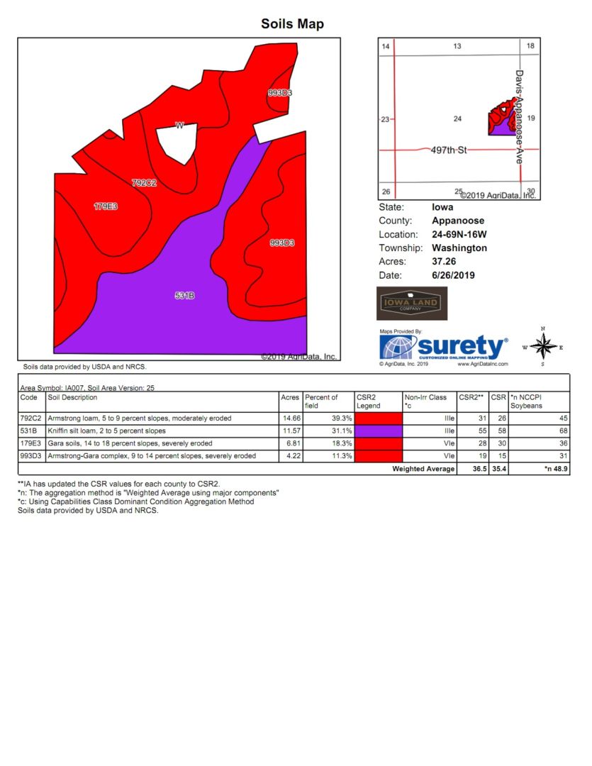 37.26 +/- Cropland Acres  |   11 +/- Tillable Acres  | 26.26 +/- Hay Acres |   CSR2 36.5