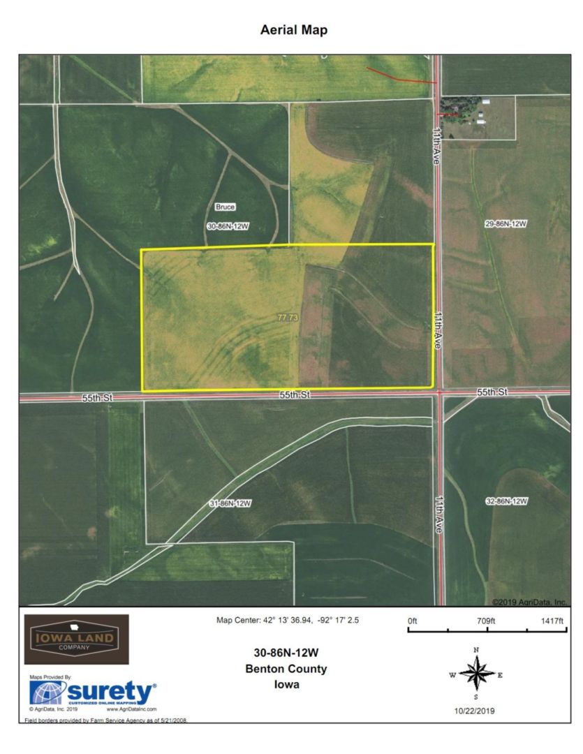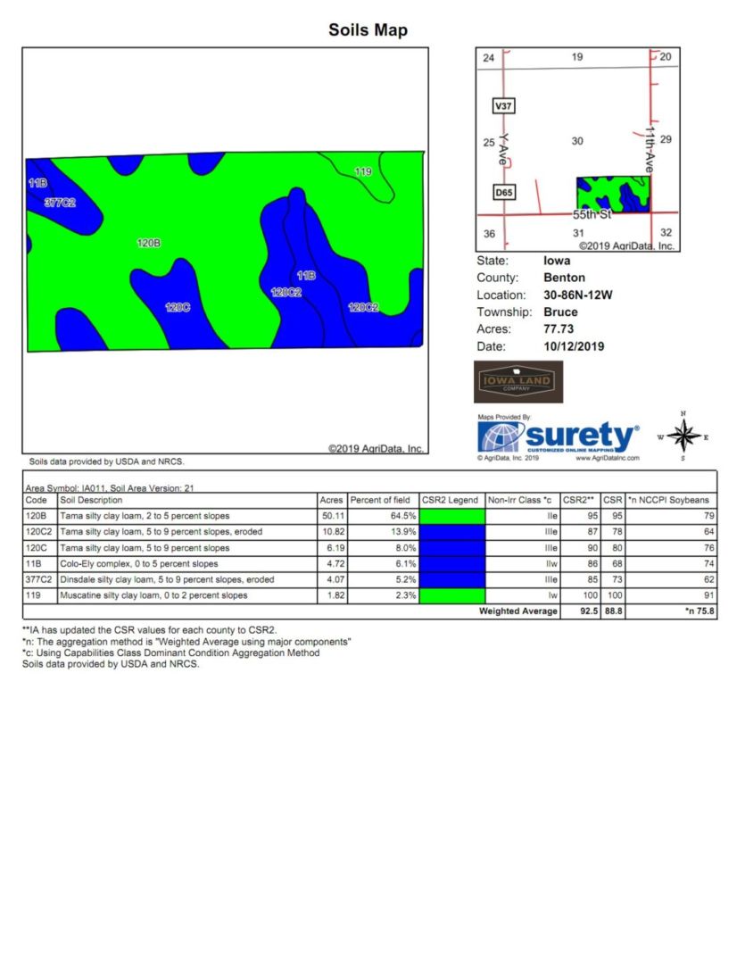 These 80 +/- acres of farmland are located in Northwestern Benton County, 5 miles northeast of Dysart, Iowa. The farm consists of 77.73 FSA tillable acres which boasts an impressive 92.5 CSR2. Tama, Colo-Ely complex, and Muscatine silty clay loam make up the majority soil types found on this farm. Farmland of this caliber does not come up for sale often in this neighborhood. If you are in the market for an extremely nice farm with little to no waste acres, look no further than this great tract located in Benton County, Iowa.