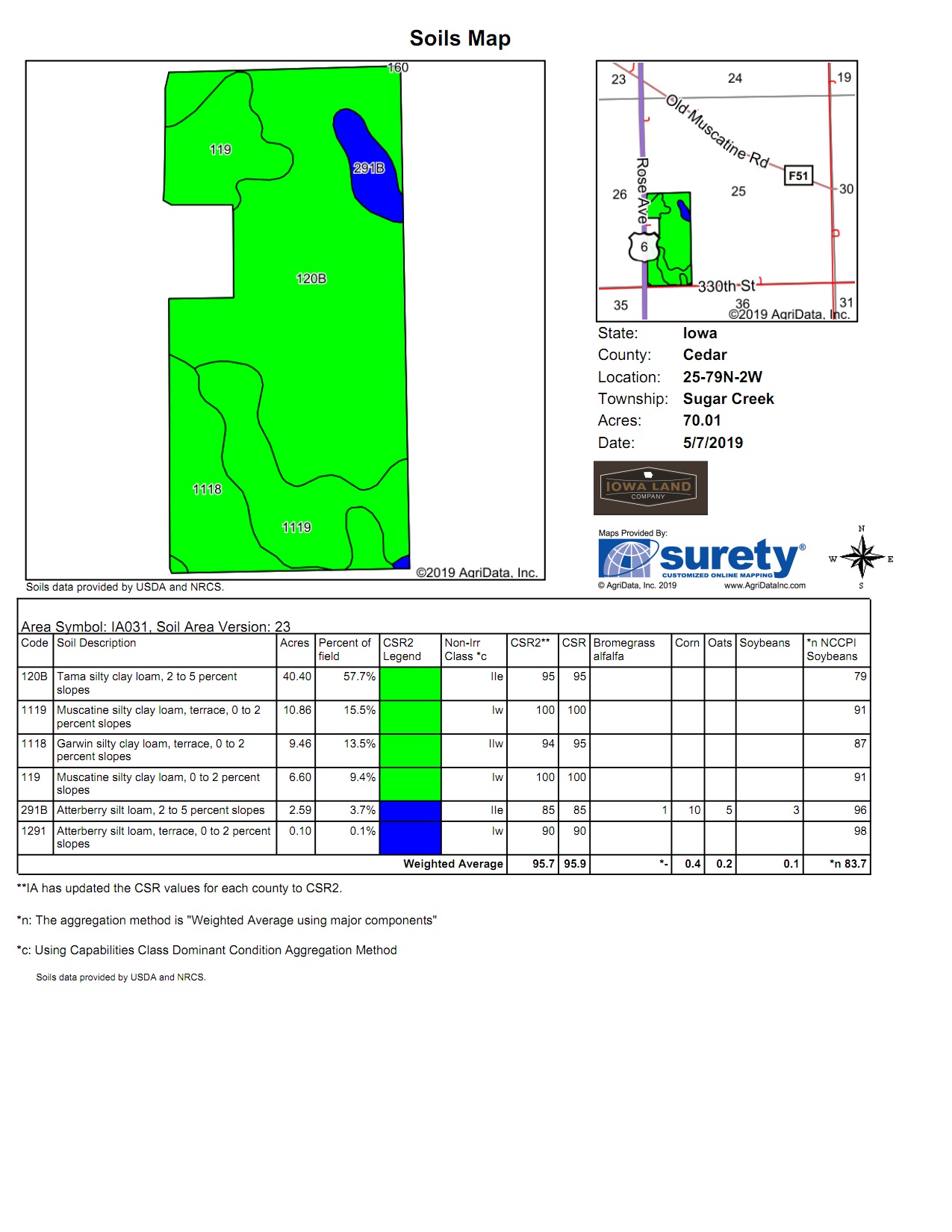 Iowa Land Company is honored to represent the Rhoda E Grunder Estate in Cedar County, IA located 1.5 miles North of Wilton Iowa. River Valley Co-Op is located 9 miles Northeast of the farm. The farm will be offered at public auction on June 27th at the Wilton Community Center @2pm. This is a great opportunity to buy an extremely well taken care of dirt in an area where farmland doesn’t often come available to the public. This farm boast an OUTSTANDING 95.7 CSR2 average and could arguably be considered one of the best farms in the state to come to public auction. Over 17 acres of the farm boasts 100 CSR2 Muscatine silty clay loam dirt. The Grunder family is very well respected throughout the Wilton Iowa community, come show your support and bid on this once in a lifetime opportunity. The farm is rented for the 2019 growing season. The property is located just one mile South of Interstate 80 making it attractive for development opportunity off HWY 38. Call Land Agent Nick Skinner at 515-650-0974 or Land Broker Cody Skinner at 515-443-6343 for more information on this Cedar County Land Auction.