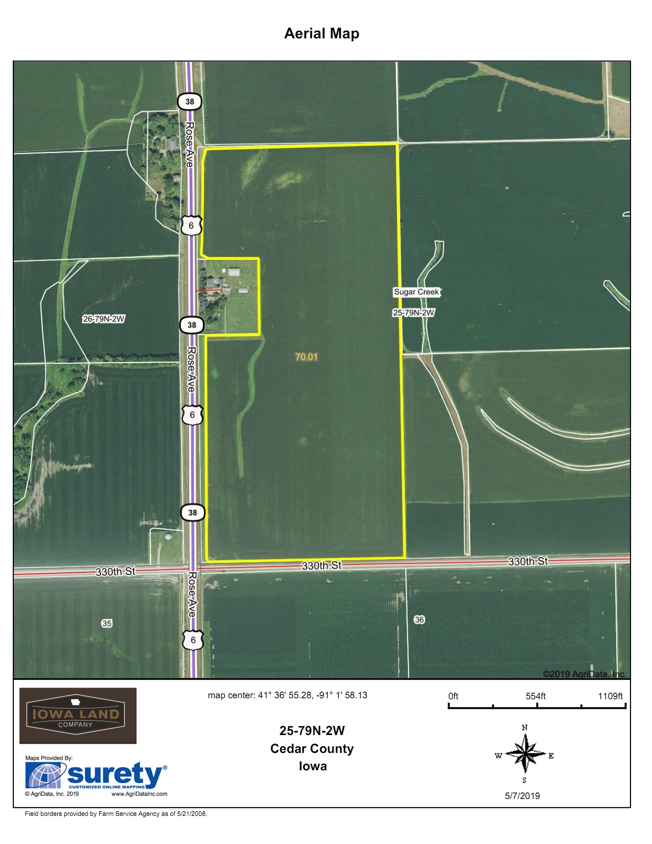 70 +/- acres located in Cedar County, Iowa; Sugar Creek Township, Section 25. Exact legal will come from the deed.