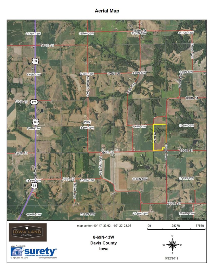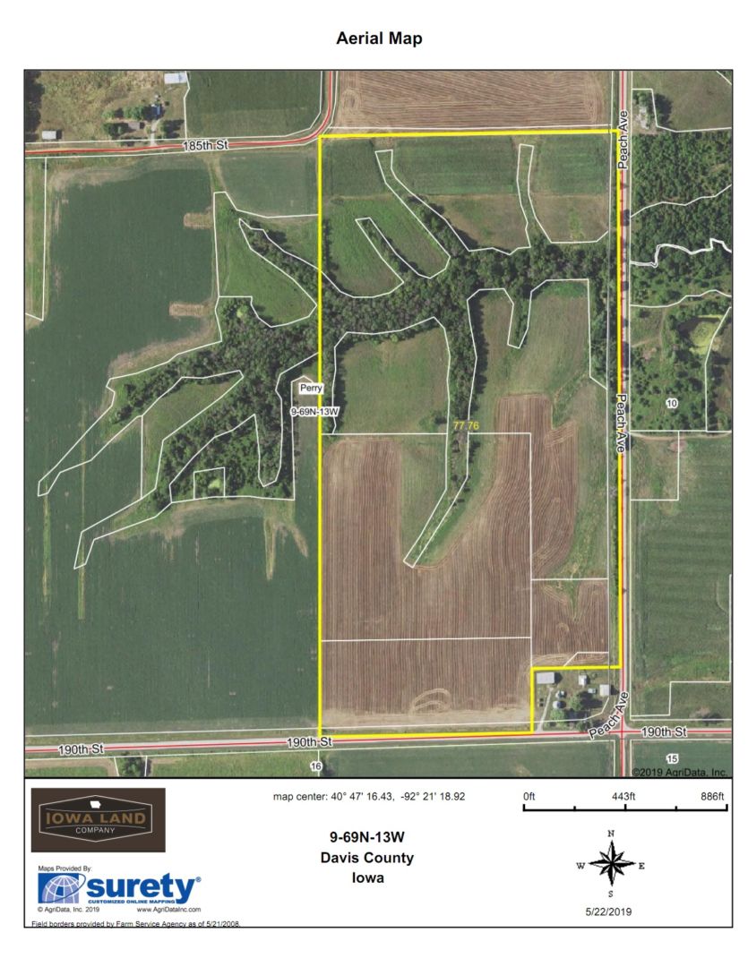 • 77.7 +/- acres located in Davis County, Iowa.  Perry Township, Section 9. See deed for exact legal description.