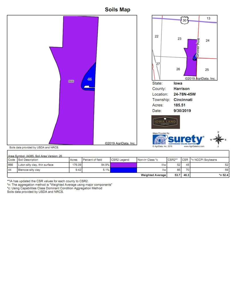 • 182 +/- acres located in Harrison County, Iowa; Cincinnati Township, Section 23/26. Exact legal will come from the deed.