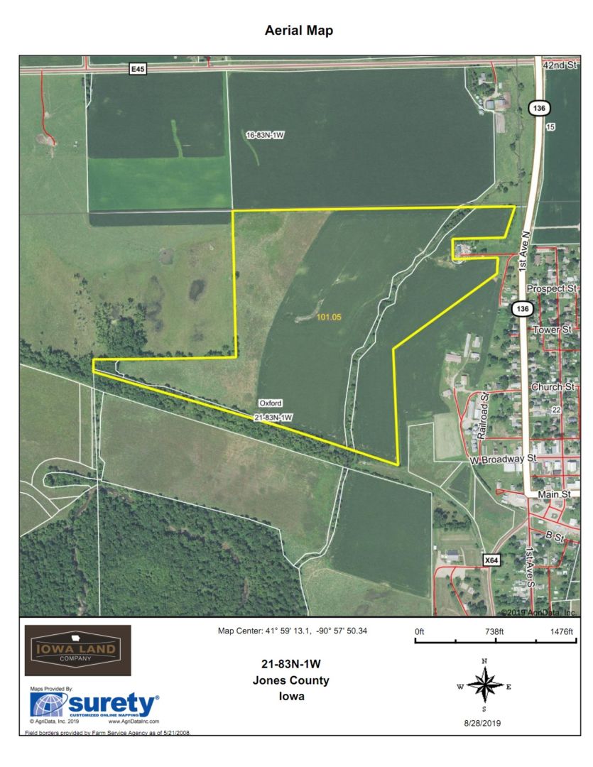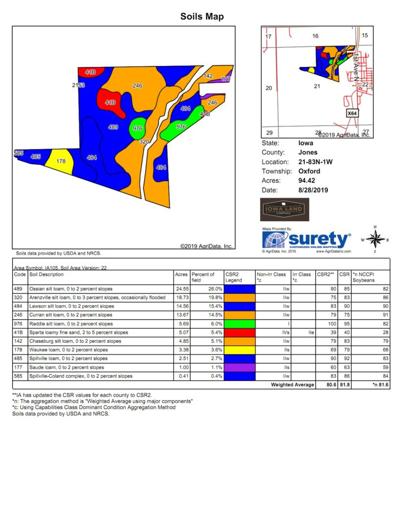 We are proud to bring to market these 101 acres located in Jones County Iowa, just west of the Oxford Junction city limits. The farm consists of 94.42 FSA Cropland acres. Of those acres, 28.78 acres are in CRP paying $7,992.49 annually ($277.71/per acre) expiring in 9-30-2025. The remaining 65.64 acres are in a corn / bean rotation, paying $18,116.64 annually ($276/per acre). Total income on the farm is $26,109.13 annually. The CSR2 average on the cropland acres is 80.6 containing a majority of Ossian, Arenzville, and Lawson silt loam soils across the farm. A newer creek crossing has been established making access to the west portion of the farm possible. A 22,000 bushel grain bin built in 1979 is located on the northeast corner of the farm. The farm lease will be open to farm in 2022.