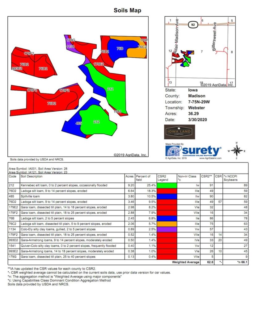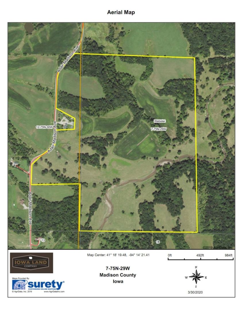 - 124 +/- taxable acres located in Adair County, Iowa Grand River Township, Section 12 and Madison County, Iowa Webster Township, Section 7 Exact legal description will come from the deed.
