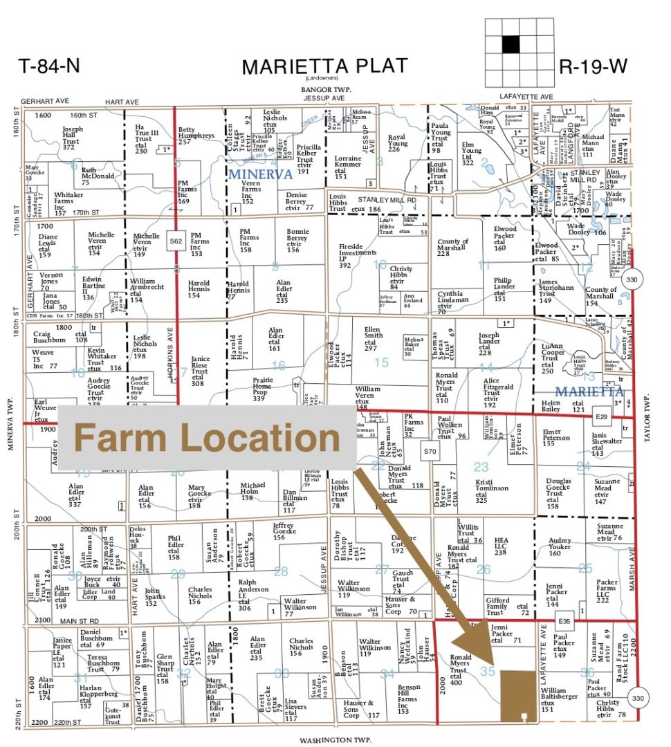 • 113.86 +/- acres located in Marshall County, Iowa; Marietta Township, Section 35. Exact deed will come from the deed.