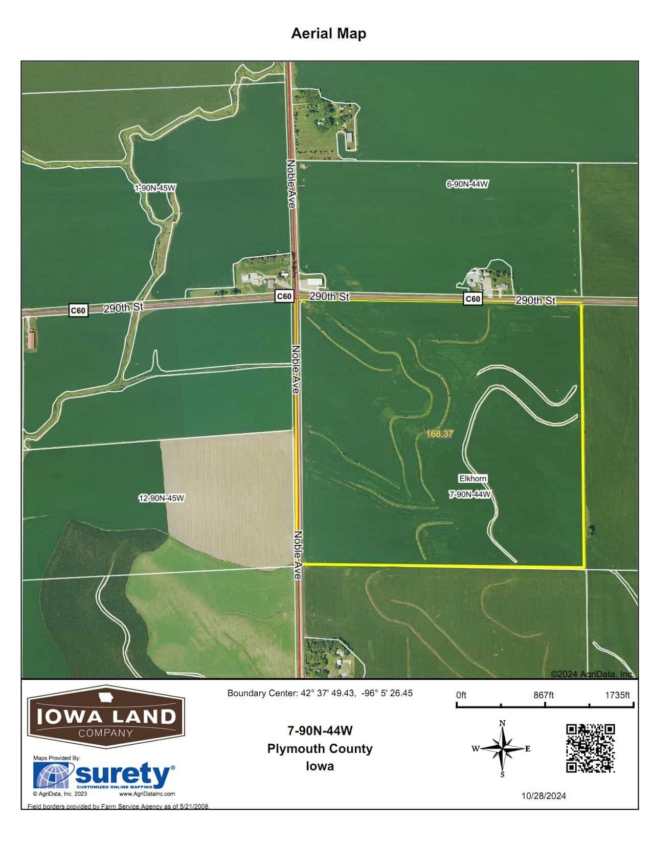 168.2 +/- acres located in Plymouth County, Iowa; Elkhorn Township, Section 7. Exact legal will come from the abstract.