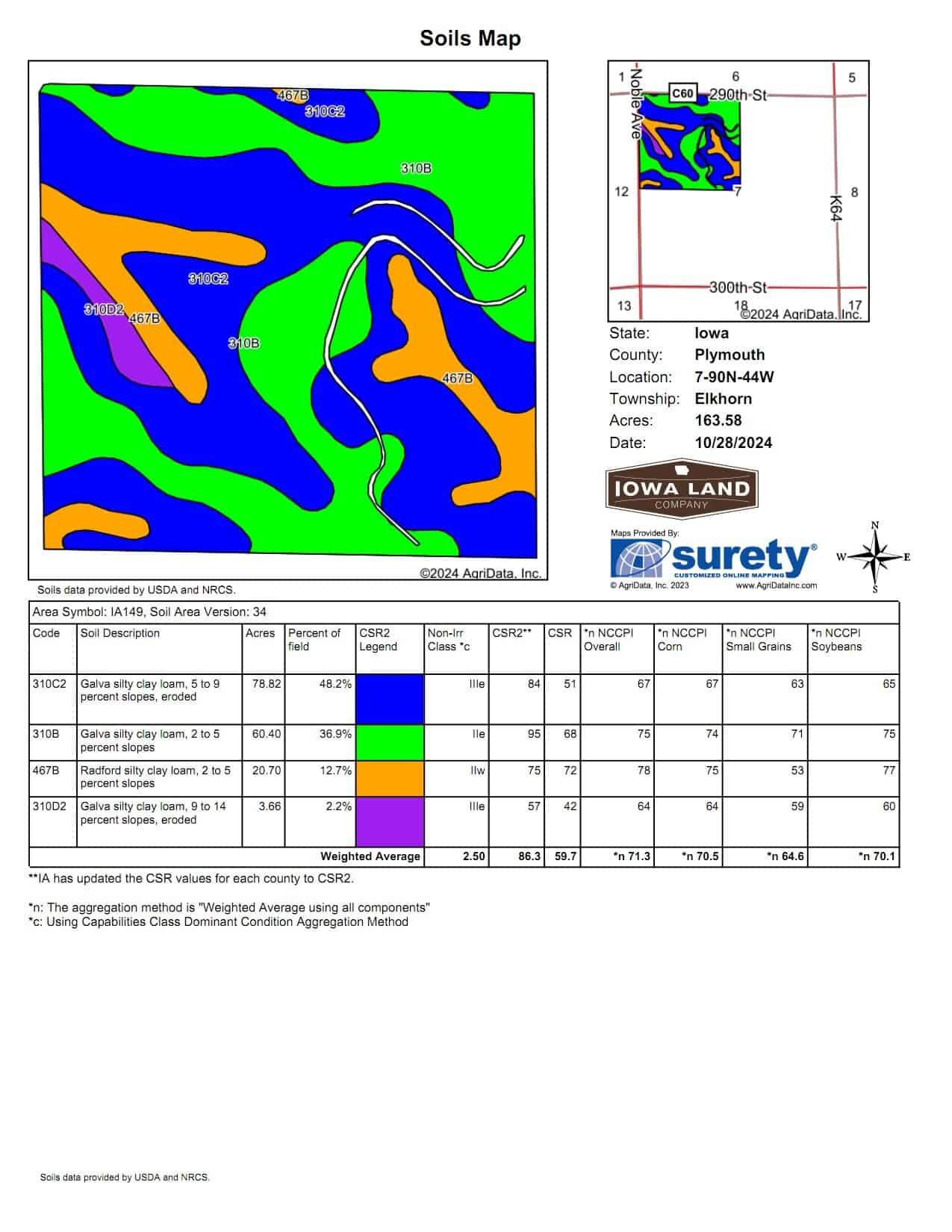 Iowa Land Company is pleased to present the Norma Davis Trust farm sale in Plymouth County, Iowa. The farm consists of 168.2 +/- acres, located 7 miles northwest of Kingsley, Iowa. The farm is situated in Section 7 of Elkhorn Township. The farm is being offered as a one-tract option. This is a great opportunity for local farmers to expand their current farming operations. Investors take a look, this is an opportunity to buy a high percentage income-producing acre farm. The farm has 165.92+/- acres considered FSA cropland acres. The current cropland acres have an 86.3 CSR2 weighted average across the cropland acres, which is above the county average. Over 85% of the farm offers soil ratings ranging from 84-95, with Galva Silty Clay Loam being the strong majority. The farm is located on a hard pavement road south side of C60. Located in a region where land is held in tight hands, this really is a once-in-a-generation opportunity to expand an operation. Located within close proximity of multiple grain selling outlets. The farm is currently being offered with an open tenancy. Â