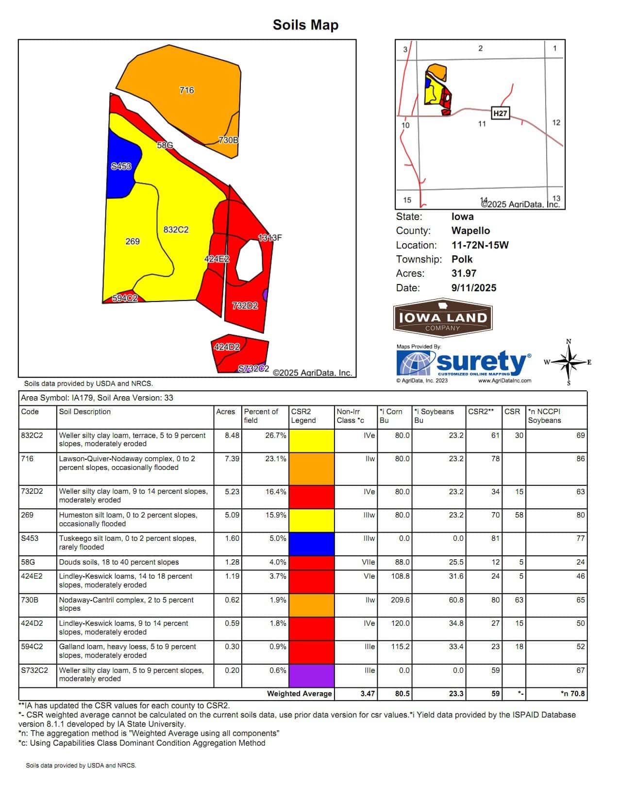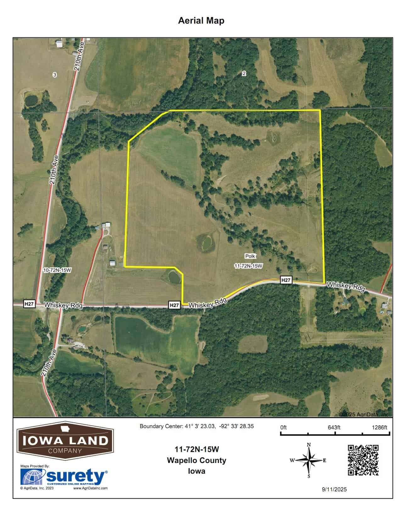 Welcome to a remarkable 107+/- acre property located in the heart of Wapello County Iowa This 107+/- acre Southern Iowa farm offers a trifecta of exceptional farm versatility and future long-term value. Whether expanding your current livestock operations, developing a diversity of farm use or investing in a sound investment in Iowa agriculture. The farm features approximately 32+/- acres in hay production with a CSR2 of 59.6. There are approximately 65+/- acres of pasture ground with new seeding from an NRCS program. There is strong fencing around the perimeter of the farm with several separate lots to rotate pastures. There are 3 ponds with 1 having a cobett water system and the other has a geo star water system. Excellent access and layout for both crop, hay and livestock operations. There is a beautiful building site on the hill that would be an awesome place and enjoy the sunset over your farm. The hay ground acres are leased on a 50/50 split until March 1, 2027.