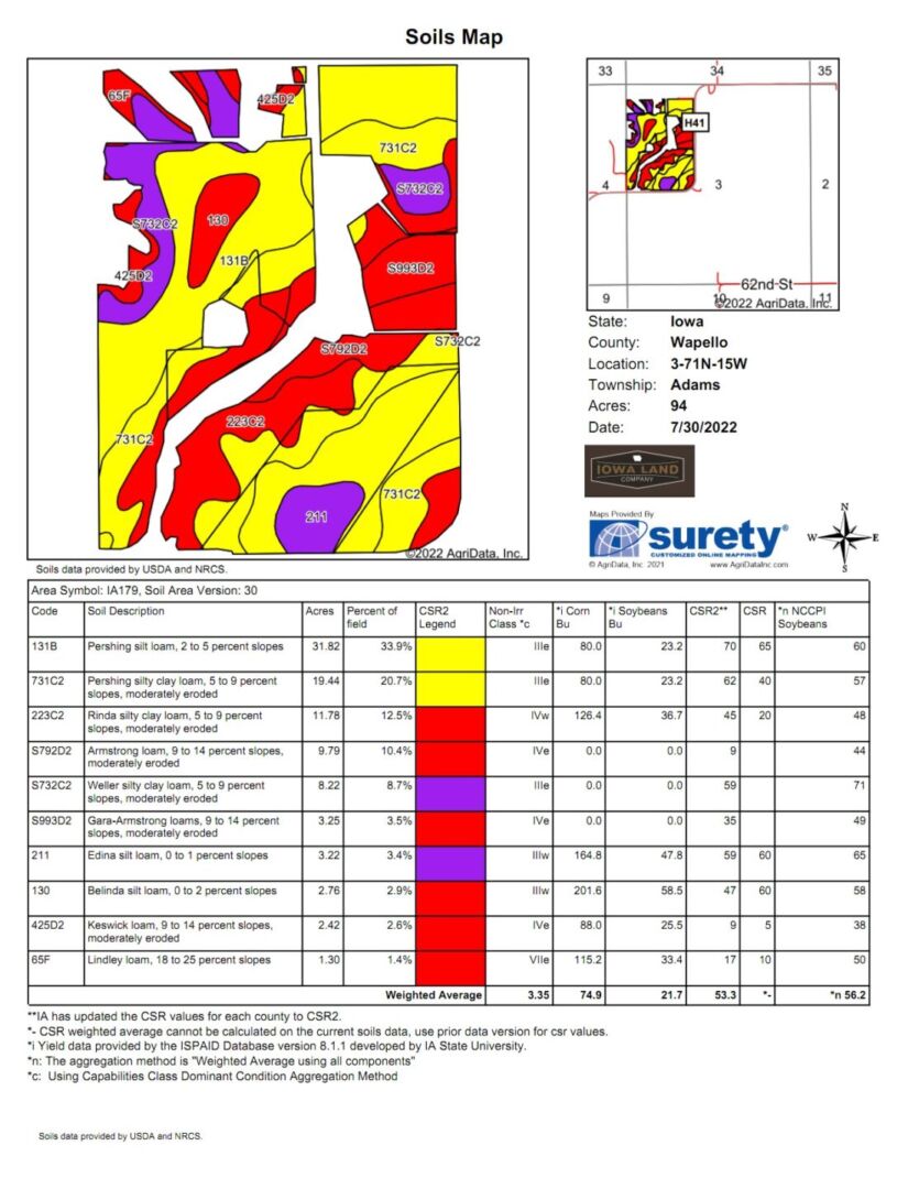 These 121 +/- acres located in Adams Township in Wapello County, Iowa just 3 ½ miles east of Blakesburg, Iowa. This is a great opportunity for a local farmer to expand their current farming operation and give investors the ability to purchase quality farmland acres in an area where farmland does not come up for sell often. The farm consists of 121 +/- acres, with 94 +/- acres considered cropland. The CSR2 weighted average is 53.3 with pershing silt loam and pershing silt clay being the majority soil types on the farm. This farm is in a great location on hard surface road, has several entrances into the farm makes which makes access easy. Farm is leased for the 2022 farm season.