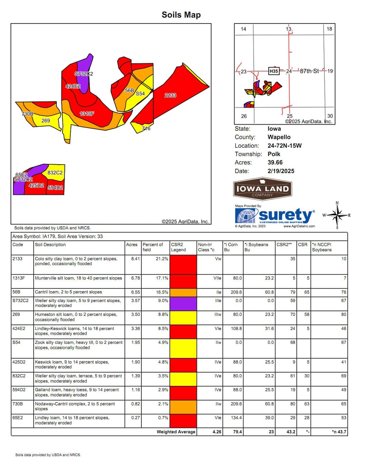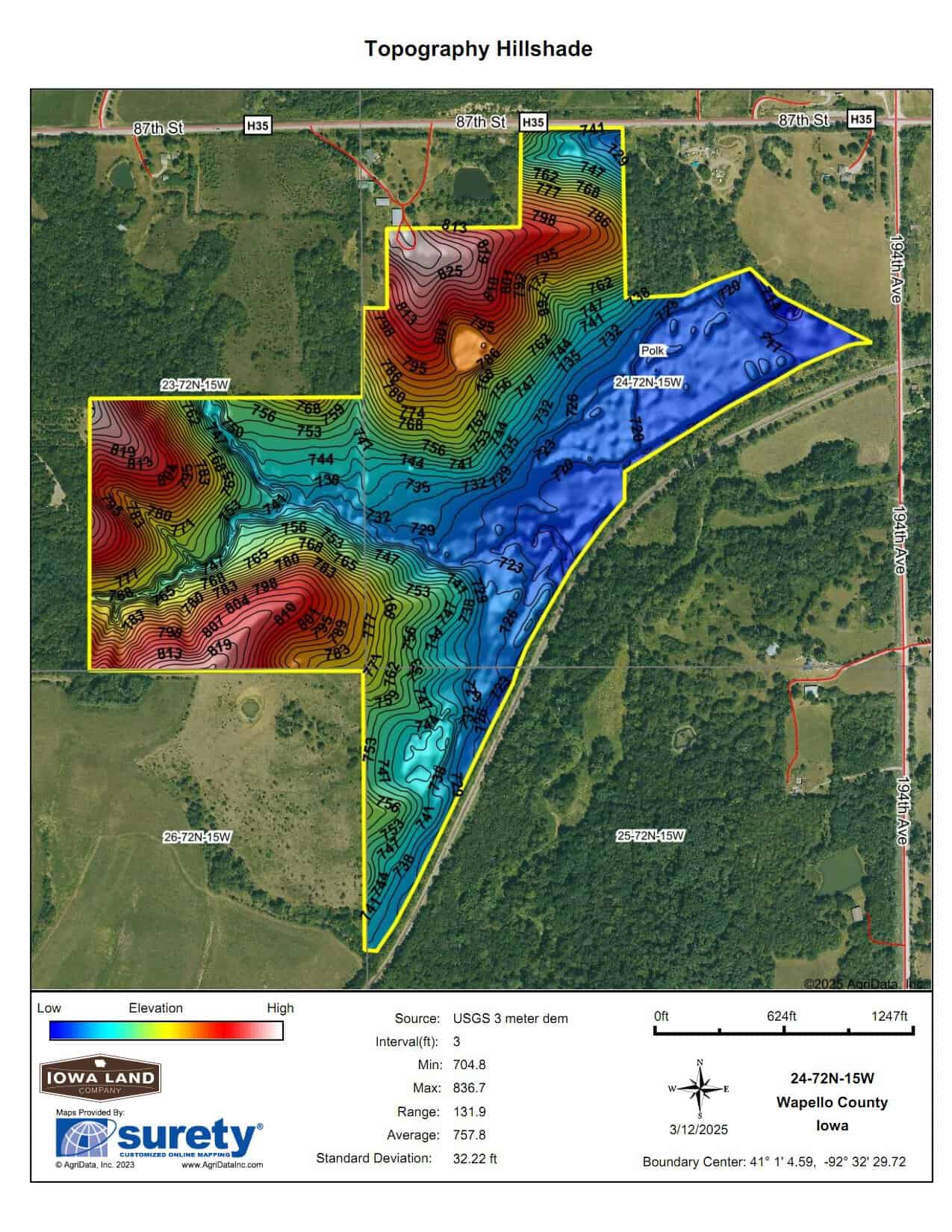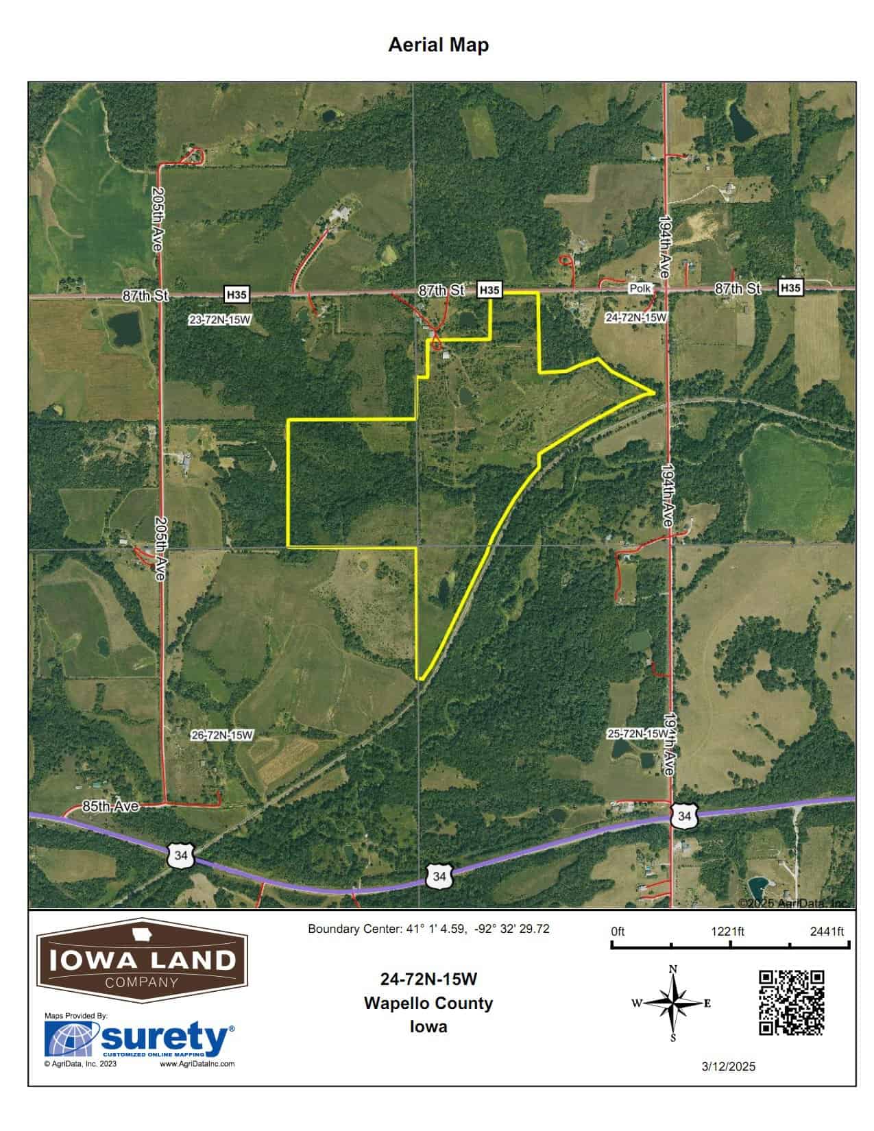 129 +/- acres located in Wapello County just 4 miles west of Ottumwa, Iowa on a hard surface road. This farm is in a low-pressure area that is known to produce and hold large mature Iowa Whitetail. The farm is set up for hunting different wind directions and not burning out one side or the other. The diverse habitat is a perfect setup for hunting mature whitetail deer. Consisting of hardwood timber, tall grasses, wetlands at the bottom, and rolling hills throughout the farm with plenty of room for strategically placed food plots can really make this recreational farm exactly what you want. There is an extensive trail system throughout the farm making it ideal to walk to and from your stand or it would be perfect for a E-bike, ATV or just hike around the f-arm. On the north side of the farm sitting on the hill is a cabin with stocked pond that overlooks the bottom that would make a great weekend getaway or that hunting cabin you always wanted! There are 2.60 acres in CRP that will expire 9-30-25. In the past the farm had CRP, corn/bean rotation and hay ground. It is now an open canvas waiting for the new owner to make it their own paradise. There is plenty of room for several food plot locations, this farm feels much larger than 130 acres and the topography makes it ideal to getting in and out of the stand without disturbing the whole farm. I saw many rubs and deer trails throughout the farm along with turkey signs and plenty of roosting trees and I did kick up a small covey of quail while touring the farm. The USDA shows 41 crop acres. There is a 14×40 shed, 50×60 (approx.) metal building with a concrete floor with lean to and 4 grain bins. There is access to the farm from 87th Street and on the southeast corner on 194th Ave. by the railroad tracks.