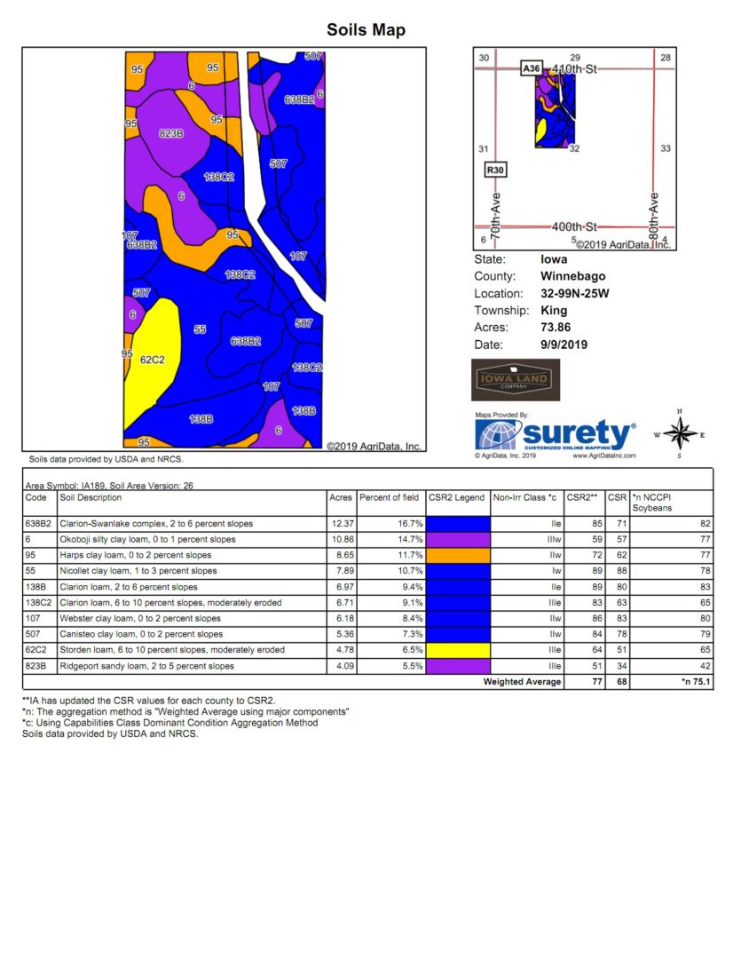Iowa Land Company is honored to represent the Phyllis R. Hays farmland auction in Winnebago County, Iowa. The farm consists of 94.21 +/- acres, located 3 miles west of Thompson, Iowa. The farm will be offered at a public auction on February 11th at the Branding Iron Round-up Room – at 1pm. The farm will be offered in two separate tracts. This is a great opportunity for local farmers to expand their current farming operation and give investors the ability to buy well taken care of farmland acres in an area where farmland does not come available to the public often! Tract 1 consists of 73.13 +/- net taxable acres, with 73 acres considered cropland acres 7.4 of those cropland acres are in CRP with a contract that has an expiration of 9-30-2022 (CRP Contract can be seen below for more details) . The CSR2 average is 77 CSR2 on tract 1, for the tillable acres. Tract 2 consists of 21.08 +/- net taxable acres, with 20.9 +/- acres considered cropland acres. The CSR2 average is 83 on tract 2. The farms have an open tenancy for the 2020 growing season. Farmland in Southwest Winnebago County is held in strong ownership. *Farms will be sold using bidders’ choice method. See you at this Winnebago County land auction!